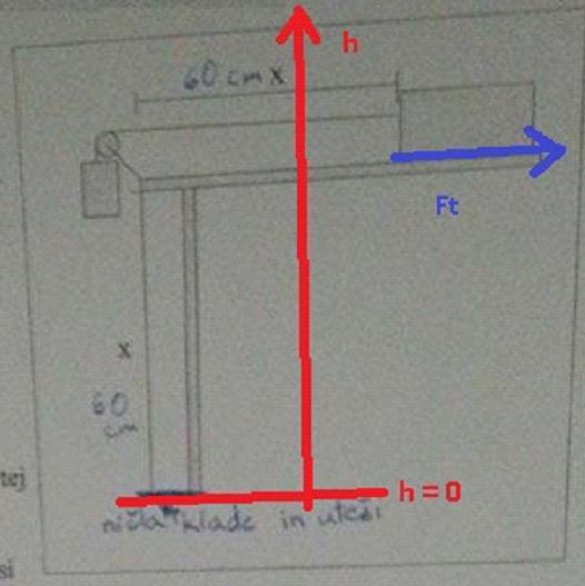 S "to potjo" je mišljeno, da iz začetne lege, ki je narisana na sliki, utež pade na tla (oz tik preden zadene tla), klada na mizi se prav tako premakne za 60 cm. Predpostavimo, da se vrv ne razteza veliko, potem smemo misliti, da ima klada na koncu prav tako hitrost 1,5 m/s.