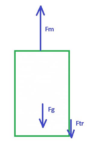 Obravnavajmo najprej pot med (1) in (2). V (1) dvigalo miruje, postavimo v najnižjo lego izhodišče za merjenje potencialne energije. Zato smemo reči, da ima v (1) dvigalo potencialno in kinetično energijo enako nič. Med (1) in (2) se dvigalo giblje pospešeno. Veča se mu potencialna energija in kinetična energija. Delo, ki je za to potrebno, opravlja sila motorja Fm. Če zanemarimo negativno delo zaviralnih sil (na sliki smo jih skupaj označili kot sila trenja Ftr), je na poti od (1) do (2) delo sile motorja Fm enako spremembi potencialne in kinetične energije. Na tej poti mora biti sila motorja Fm večja od teže dvigala.