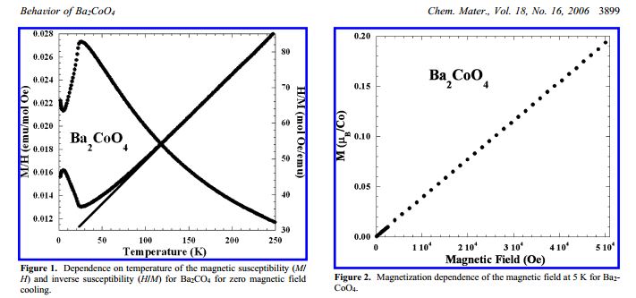 | Co4+ | S=5/2, mu_eff=5.9 BM, XT= 4.35 emu K/mol | S=3/2, mu_eff=3.9 BM, XT= 1.90 emu K/mol | S=1/2, mu_eff=1.7 BM, XT= 0.36 emu K/mol |