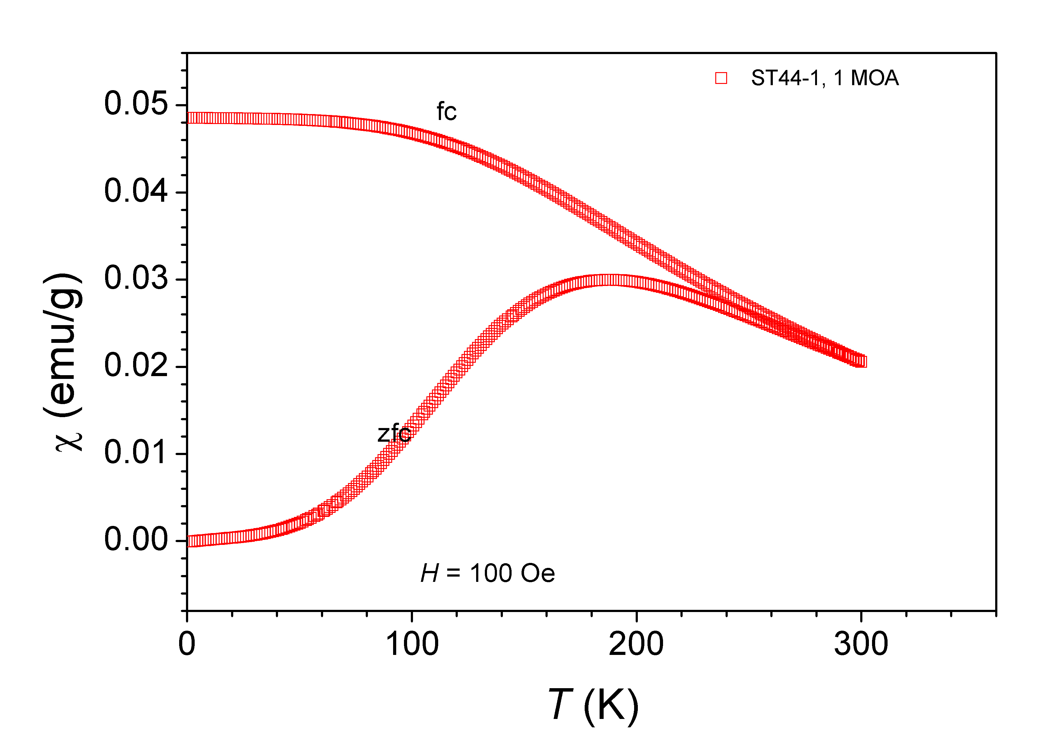 Nanoparticles: superparamagnetic at room temperature and above. Blocking temperature depends on NP diameter. For example: 100 Oe, TB = 77 K for 4 nm NP [Contrast Media Mol. Imaging 3 150-156 (2008)]